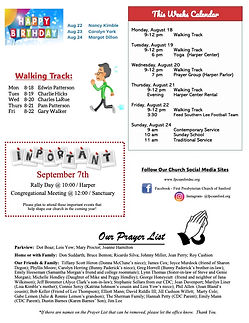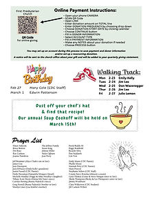 First Word is our weekly newsletter. It is sent out every Monday morning and contains current events and happenings in the church, a calendar, a walking track volunteer schedule and more. It is also on our Facebook page.